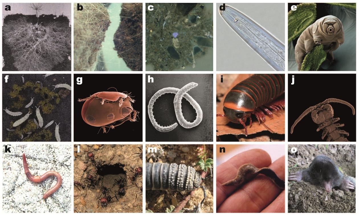 多样的土壤生物。(a)外生菌根;(b)真菌;(c)细菌;(d)线虫;(e)缓步类动物;(f)弹尾虫;(g)螨类;(h)蠕虫;(i)节肢动物-千足虫;(j)节肢动物-蜈蚣;(k)蚯蚓;(l)蚂蚁;(m)木虱;(n)扁虫;(o)鼹鼠。(图片来源:文献[4])