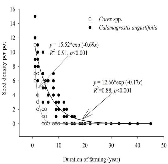 明确了纬度、水深和开垦年限是影响土壤种子库结构和规模的关键限制性环境因素。发现沼泽湿地开垦后,随着开垦年限的增加,土壤种子库结构和规模发生变化,湿地物种丰富度及种子密度呈现指数函数快速下降趋势,而非湿地物种维持在一个稳定的低水平。在开垦1-5年内,土壤中仍含有莎草、禾草、非禾草、灌木四类沼泽湿地植物功能群的种子,湿地植被自然恢复潜力巨大,这类退耕地为湿地自然恢复的优先区域。开垦6-15年内,莎草类植物种子在土壤中消失,而禾草、非禾草、灌木植物的种子在土壤中依然存在,这类退耕地依然具有自然恢复成新生的湿地植物群落的潜力,为湿地自然恢复的次优先区域。当开垦年限在16年以上时,绝大部分湿地植物种子在土壤中消失,非湿地植物逐渐占有优势,湿地自然恢复难度巨大,这类退耕地需进行湿地植被人工重建。