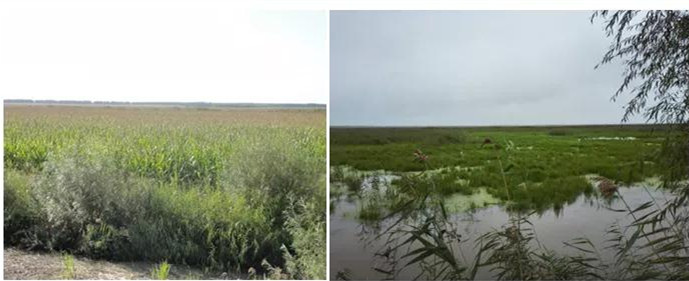 退耕还湿地沼泽湿地植被恢复效果(左图:恢复前;右图:恢复后)