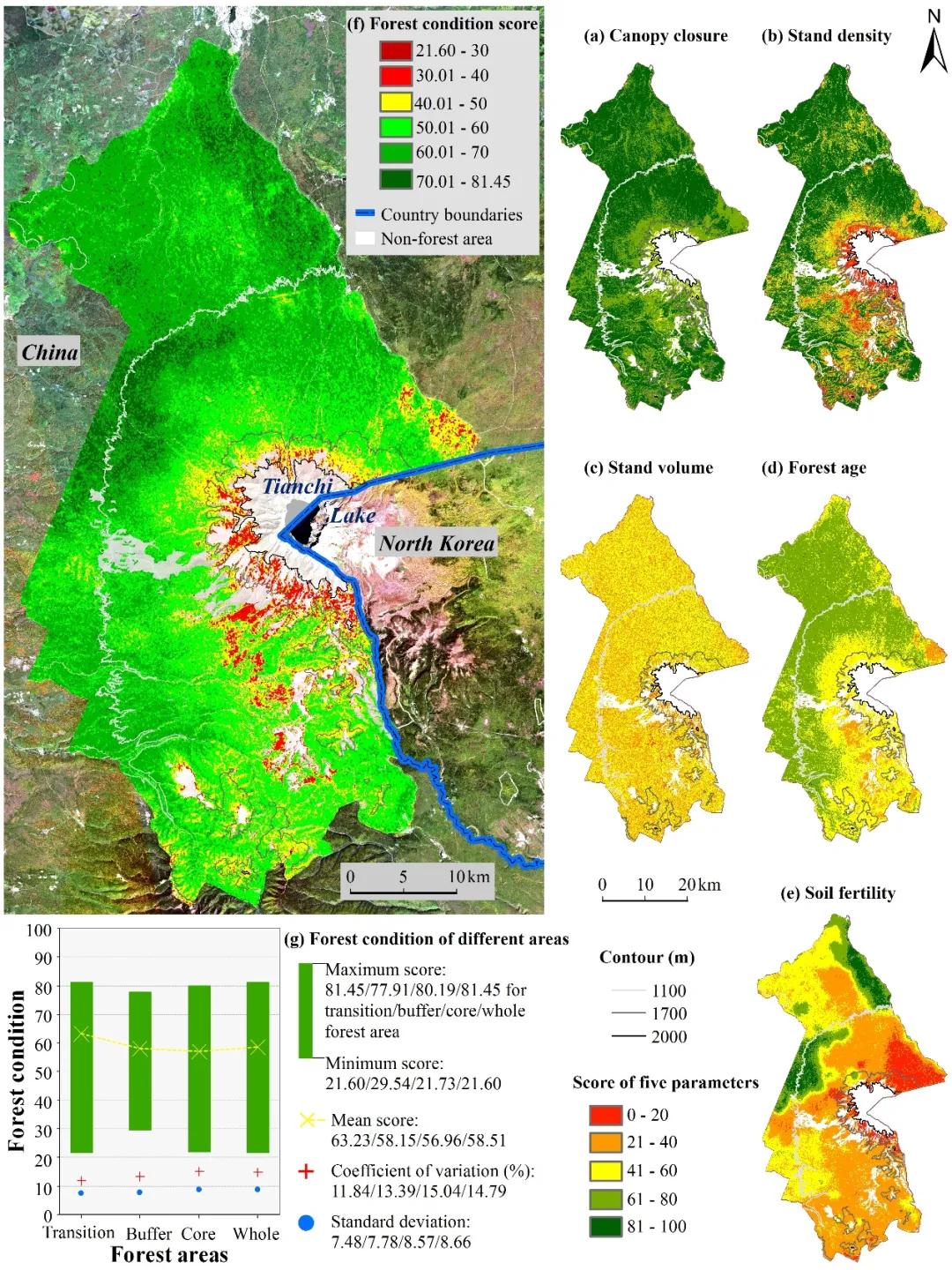 该研究系统分析了遥感因子与各参数的关系,并通过统计回归、随机森林、随机森林克里金等遥感建模方法,反演获得长白山国家自然保护区林龄、郁闭度、立木密度、蓄积量和土壤肥力等参数的空间分布;在此基础上,利用主成分分析法确定各参数权重,绘制了长白山国家自然保护区森林健康状况空间分布,并对评价结果进行了不确定性分析。