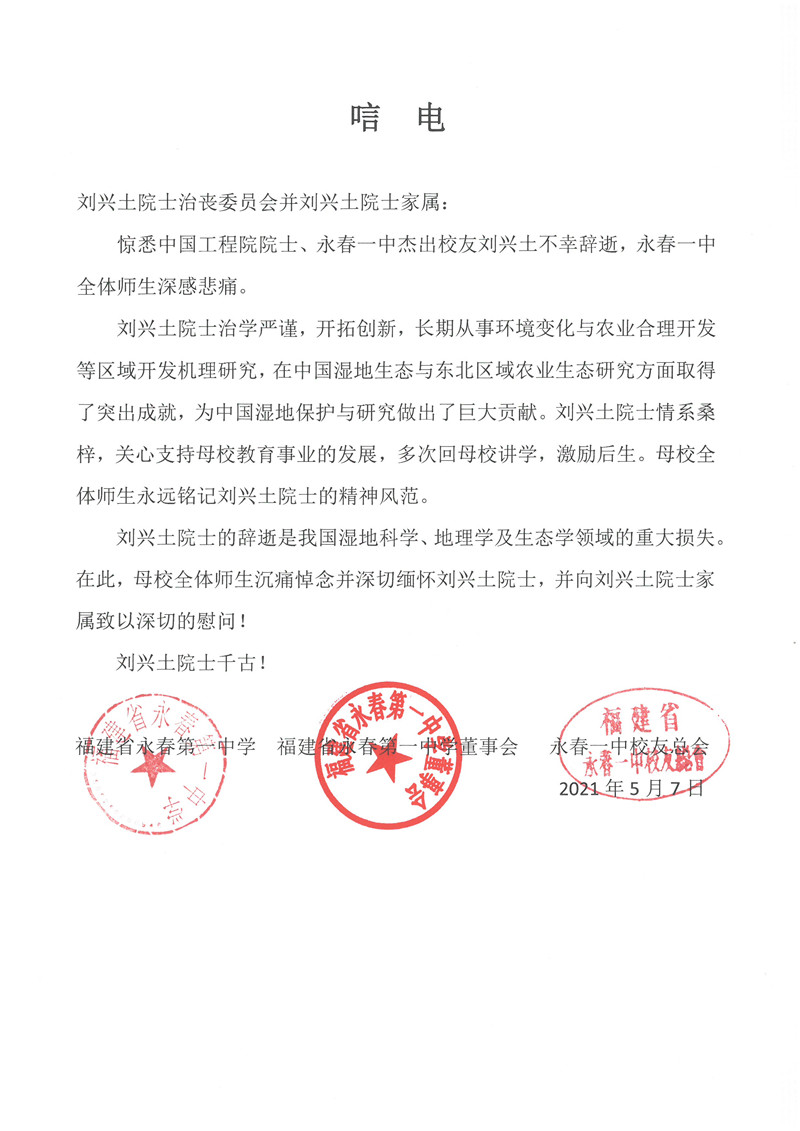 唁电-福建省永春第一中学 福建省永春第一中学董事会 福建省永春一中校友总会
