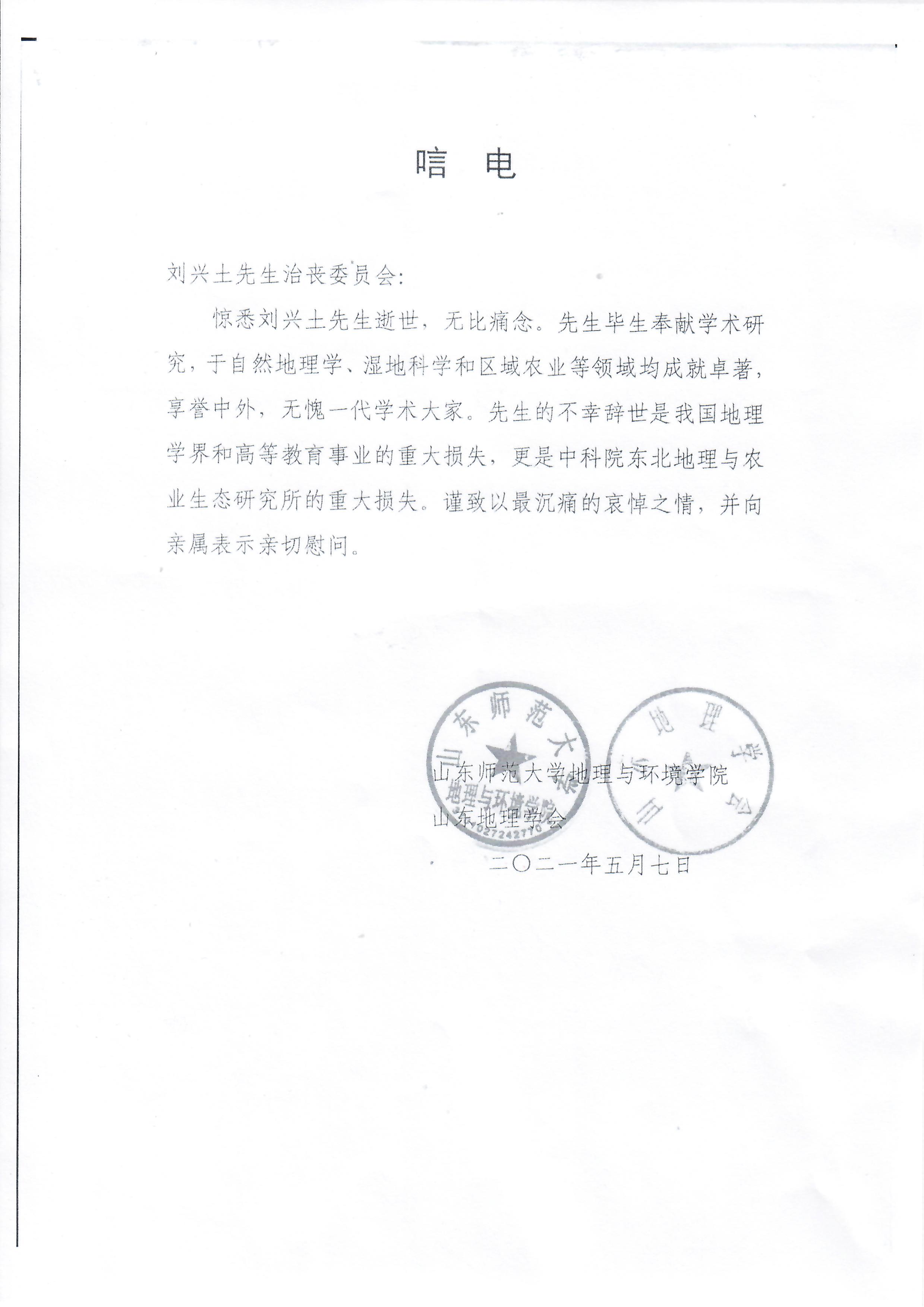 唁电-山东师范大学地理与环境学院、山东地理学会