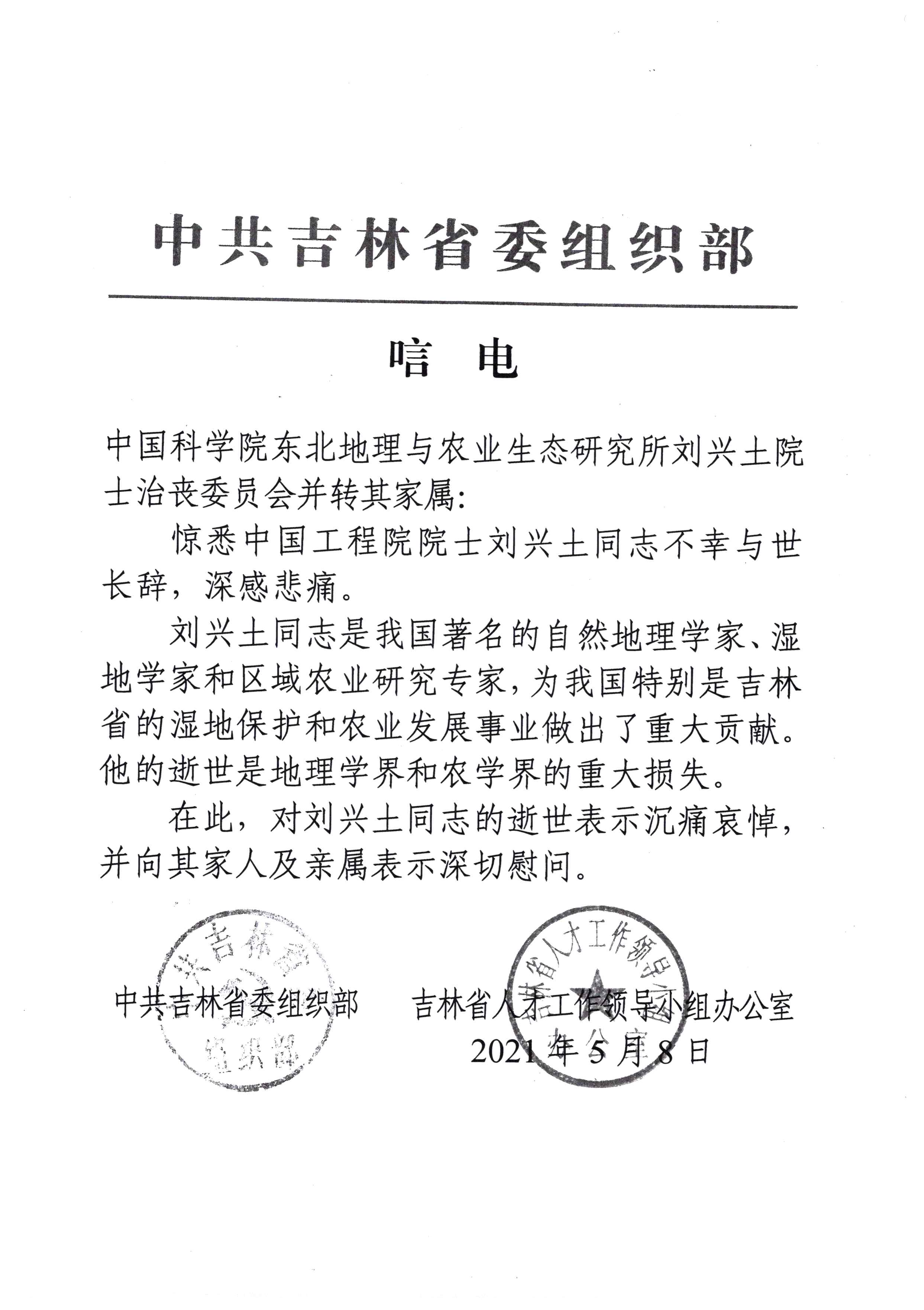 唁电-中共吉林省委组织部、吉林省人才工作领导小组办公室