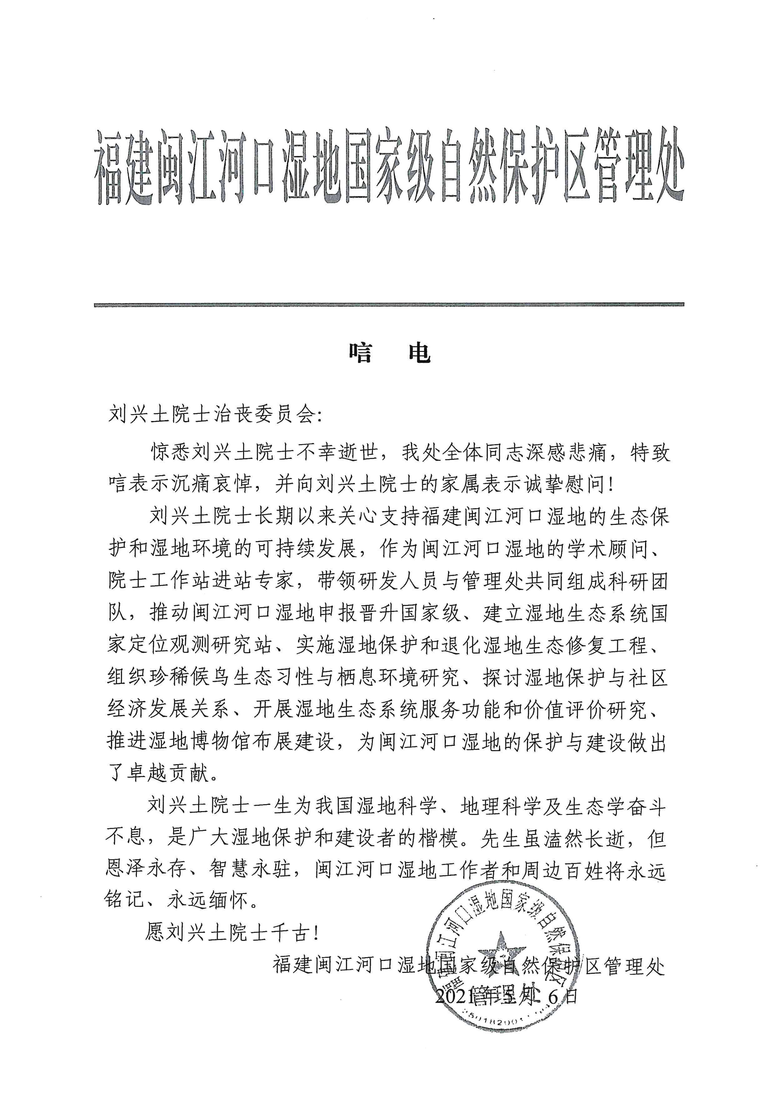 唁电-福建闽江河口湿地国家级自然保护区管理处