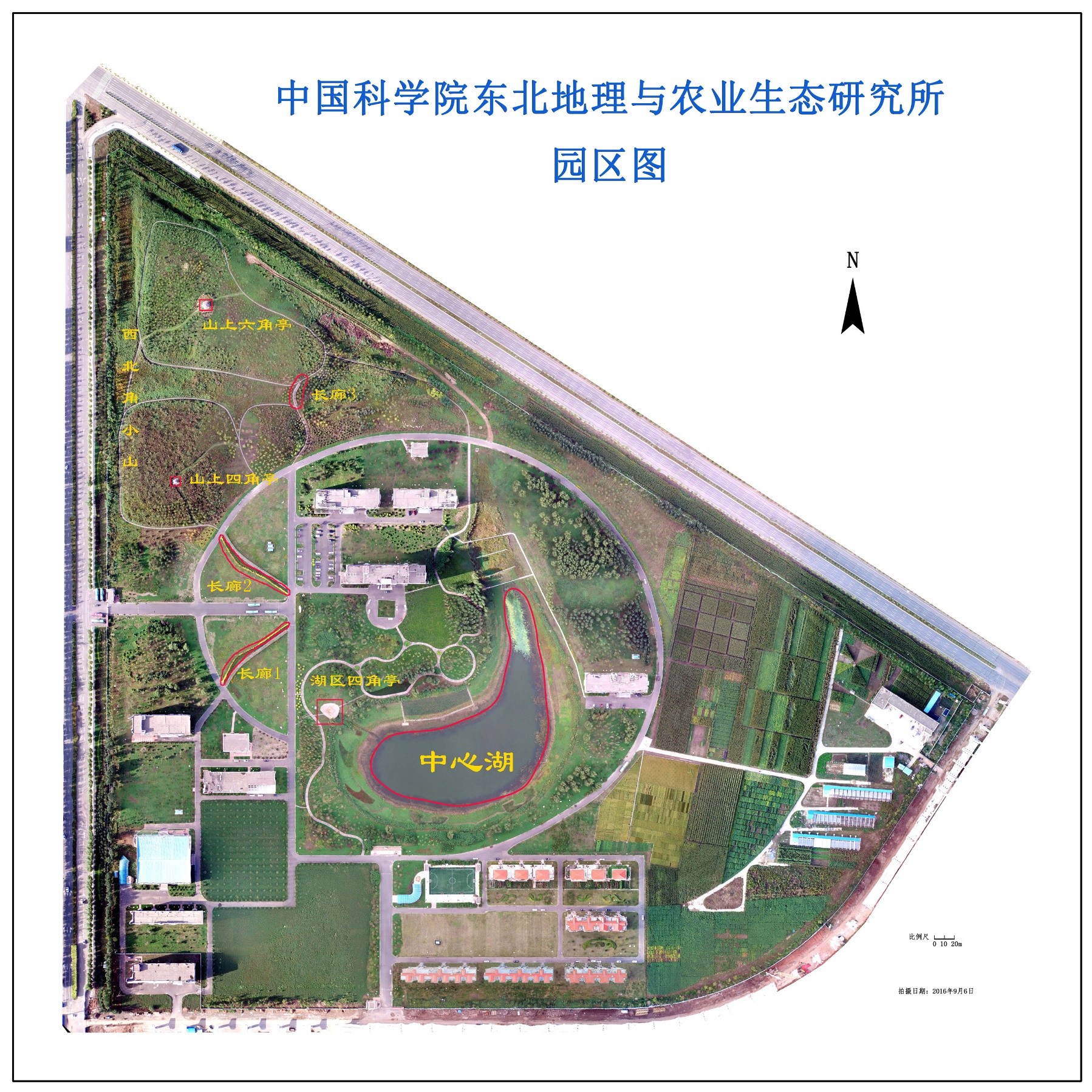 本次命名的景观包括中心湖、西北角的小山、三条木质长廊、三个凉亭。