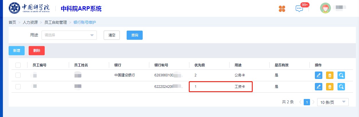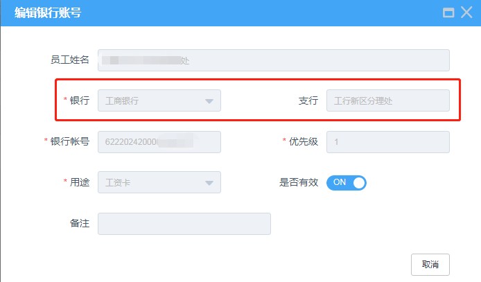 路径为:人力资源—员工自助—银行账号维护,选择优先级为“1”的“工资卡”右侧编辑按钮,核对其中“银行”及“支行”信息是否有误。