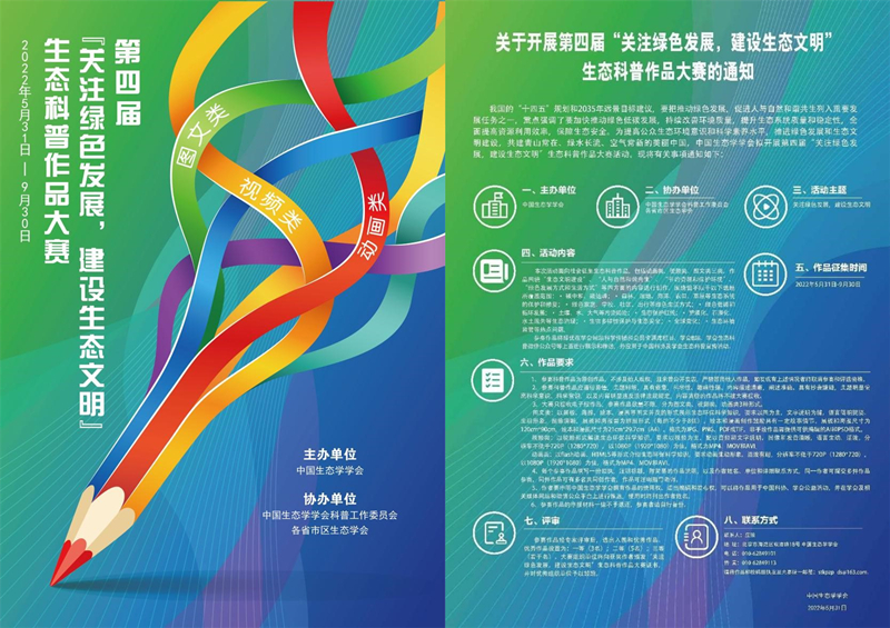 我国的“十四五”规划和2035年远景目标建议,要把推动绿色发展,促进人与自然和谐共生列入重要发展任务之一,重点强调了要加快推动绿色低碳发展,持续改善环境质量,提升生态系统质量和稳定性,全面提高资源利用效率,保障生态安全。为提高公众生态环境意识和科学素养水平,推进绿色发展和生态文明建设,共建青山常在、绿水长流、空气常新的美丽中国,中国生态学学会拟开展第四届“关注绿色发展,建设生态文明”生态科普作品大赛活动。现将有关事项通知如下: