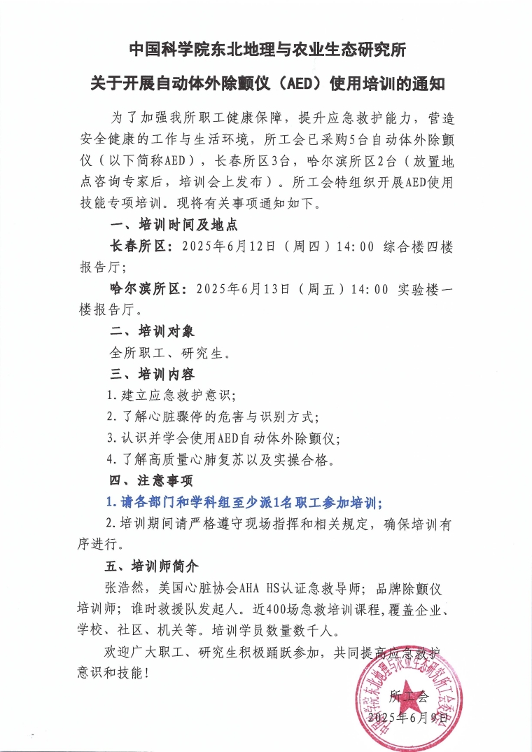 中国科学院东北地理与农业生态研究所关于开展自动体外除颤仪(AED)使用培训的通知