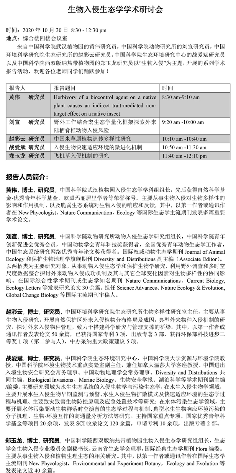 生物入侵生态学学术研讨会通知-黄伟 研究员、刘宣 研究员、赵彩云 研究员、战爱斌 研究员、郑玉龙 研究员