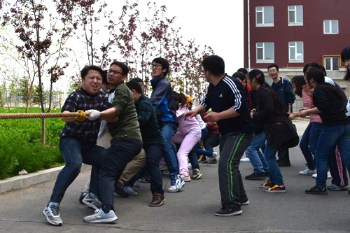 首先进行拔河比赛,赛队伍精神抖擞、意气风发,齐心协力将绳子拉向自己一方。在场拉拉队员们群情激昂,整齐的喊着“一二,一二”、“加油,加油”的口号,鼓舞着全体参赛队员。经过激烈的角逐,毕业生队获得拔河冠军。
