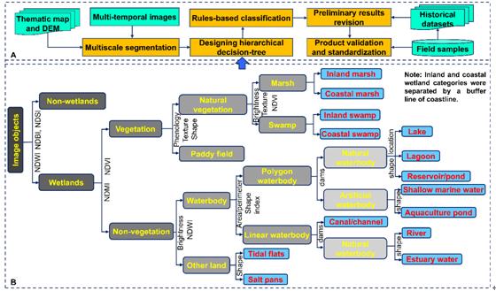 中国科学院东北地理与农业生态研究所地理景观遥感学科组研究人员结合国际湿地公约(Ramsar)的湿地定义,充分考虑中空间分辨率遥感影像的分类潜力和湿地科学研究的应用需求,构建了适合于中国湿地特点的、面向中空间分辨率遥感影像的湿地遥感分类系统,将中国湿地分为3个大类14个二级类。通过覆盖全国范围的野外调查,并收集相关国家重大科研项目野外调查数据,构建了具备海量样点的湿地样本数据库。在以上工作的基础上,研发了集成面向对象方法与多层次决策树的分类方法(hybrid object-based and hierarchical classification approach, HOHC),应用1436景Landsat 8 OLI遥感数据,完成了2015年高精度中国国家尺度湿地分布信息提取(我们将此数据命名为CAS_Wetlands),分类精度高达95%。
