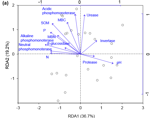 图2 细菌(a)和真菌(b)群落结构与土壤性质的RDA分析