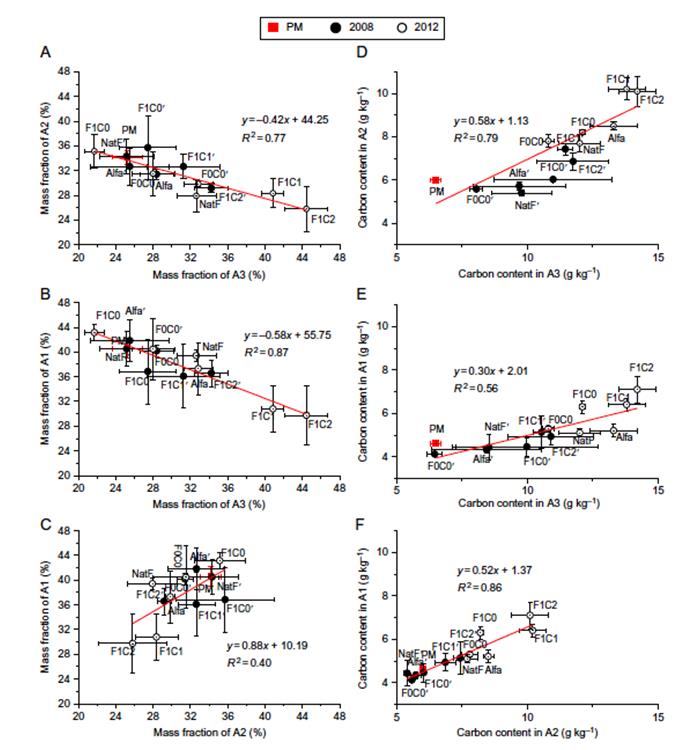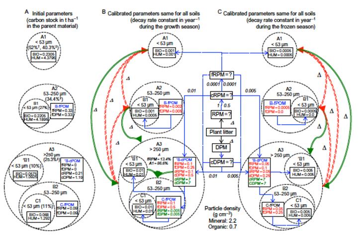 东北地理所土壤物质循环学科组基于黑龙江海伦农田生态系统国家野外科学观测研究站内的黑土母质熟化定位试验,通过土壤团聚体分级、闭蓄态微团聚体分离和13C-核磁共振技术,1)区分了夏季和冬季土壤不同组分碳的腐解和转化速率参数,建立了黑土母质熟化过程中土壤有机质、土壤结构和土壤团聚过程的CAST模型,并以2年实测试验数据进行校准,成功预测了黑土母质在熟化初期土壤有机质和团聚体耦合动态变化过程,发现母质在熟化初期,多年生自然植被恢复和农田化肥加秸秆还田措施使土壤中> 0.25 mm的大团聚体比例增加,特别是其内颗粒有机质含量增加显著,而0.053–0.25mm的微团聚体和< 0.053 mm的粉黏粒比例减少;2)初步描述了母质熟化初期土壤的团聚化过程及控制因子。土壤初级团聚化过程首先发生于植物腐解形成的有机质碎片周围,有机碎片被黏粒包裹不断形成闭蓄态组分,闭蓄态组分不断分解,包裹于其外的初级大团聚体不断形成。初级大团聚体继续分解破碎,又形成次级微团聚体、大团聚体和粉黏粒。该初级团聚化过程更多受母质属性影响,而受田间施化肥和秸秆等有机物质还田量的影响很小。而农田管理措施通过改变有机质在不同粒径团聚体中的转运效率,影响土壤的次级团聚化过程,进而影响土壤团聚体周转及其内部保护的土壤有机质的稳定化过程;3)进一步揭示了团聚体内部有机碳组分的化学结构和稳定性机制,发现外源碳经过一系列的分解和转化,更多的被固存在微团聚体内的粉黏粒组分中,主要以烷基碳、芳香族碳和羰基碳为主,这部分碳受土壤团聚体的物理化学保护作用较大,且更多来源于微生物活动的代谢产物,有机质的稳定化程度较高。而在较大粒径的大团聚体或粗颗粒有机质中,来源于植物残体的烷氧基比例更多,其活性和微生物可利用性更高,更容易被微生物和植物分解利用。研究结果对于揭示土壤有机质与团聚体的耦合作用机制、正确评价退化黑土的肥力快速恢复过程及有机质稳定性机制具有重要意义。