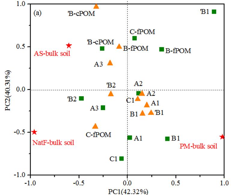 图3 母质发育初期表层土壤不同粒径团聚体内有机碳化学组成主成分分析图