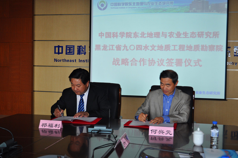 2013年10月9日,黑龙江省九○四水文地质工程地质勘察院院长祁福利、副院长鲁守刚、副总工程师姜吉生、企划部主任甘云利等一行访问东北地理所,并与该所签署了战略合作协议书。签字仪式在综合楼五楼多功能会议厅举行,东北地理所所长何兴元和黑龙江省九○四水文地质工程地质勘察院院长祁福利代表双方签署协议,东北地理所副所长黄铁青等参加了签字仪式。
