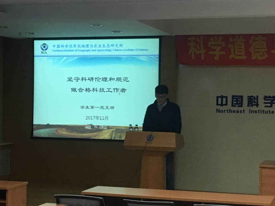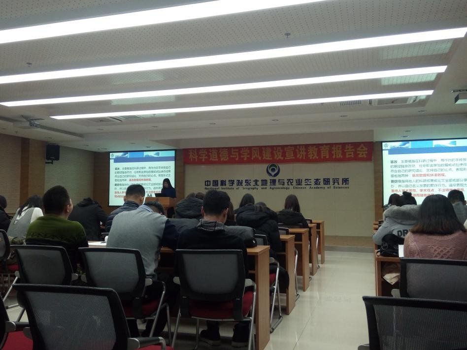 2017年11月16日上午10时,由东北地理所研究生部和研究生党总支部共同主办的“科研道德与学风建设宣讲教育活动”专题报告会在地理综合楼四楼报告厅举办。此次活动以“弘扬科研道德,倡导学术诚信”为主题,旨在继承和弘扬我所“团结、务实、开拓、发展”的精神,进一步保持和发扬我所的优良学风,更好地培养品学兼优、人格高尚且具有创新意识的高素质人才。研究生党总支部书记王玉荣老师出席了本次活动,同时参加本次活动的同学有2017级博士和2016级硕士研究生以及其余各年级的党员和积极分子。