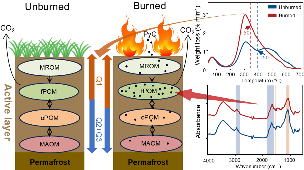 与此同时,连续低强度的计划火烧降低了多年冻土区泥炭地的土壤碳稳定性,火后热解碳的输入成为泥炭土壤轻组碳组分的一部分,并主要保留在fPOM组分中(图 3)。进一步化学分析表明,计划火烧导致fPOM碳成分变化,火烧区的fPOM中芳香度增加了32%,这意味着泥炭土壤fPOM组分的稳定性明显增加。然而,连续火烧后泥炭土壤热稳定性下降,表现为Q1比例增加以及T50降低,计划火烧通过改变fPOM碳组成,影响了土壤热稳定性。而尽管增加了fPOM中芳香族化合物含量,但同时也促使土壤酶活性和二氧化碳的排放量的增加,对土壤碳稳定性产生了十分复杂的影响。
