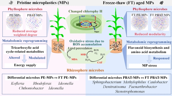该研究首次揭示冻融老化过程会差异化调控不同微塑料对作物的毒性效应与作用机制,为深入认识寒冷地区农业生态系统中老化微塑料的生态毒理风险提供了重要的科学依据。