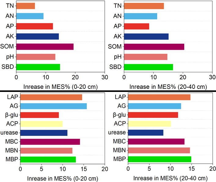 在系统解析不同土壤类型(白浆土、黑土、棕壤)的肥力与产量核心限制因子方面取得了突破。综合运用主成分分析、随机森林等方法,在不同土层深度(0-20 cm和20-40 cm)识别出影响各土壤类型综合肥力及玉米产量的关键物理、化学及生物学指标。研究表明,土壤有机质、速效钾、容重、有效氮素、土壤pH以及特定土壤酶活性(如N-乙酰氨基葡萄糖苷酶、L-亮氨酸氨基肽酶)和微生物指标(如微生物量碳/氮)是主要的限制性因素,但其具体组合和主导作用因土壤类型和土层深度的不同而存在差异(图1)。例如,在白浆土中,表层有机质和速效磷对肥力贡献显著,而深层则更侧重微生物量氮和有机质;在黑土中,表层有机质贡献最大,深层则速效钾影响较大;棕壤中,表层速效钾权重高,深层则L-亮氨酸氨基肽酶对土壤质量贡献突出。同时,还明确了不同区域根系层微生物群落变化的主要限制性微生物类群及其关键环境驱动因子,并揭示了高产田与低产田在土壤微生物功能上的显著差异,为靶向改良土壤微生物区系提供了依据。