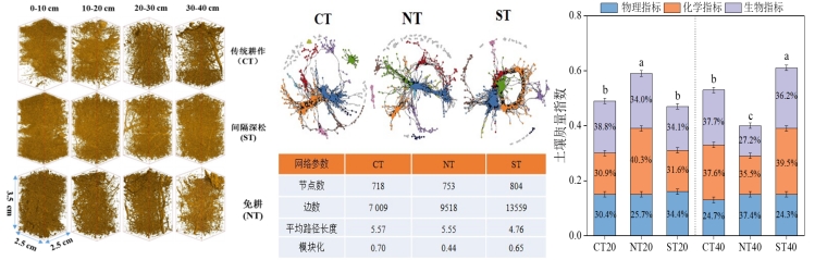 在黑土区农田土壤结构退化机制、生物学效应及优化调控方面取得了重要性进展。研究阐明了不合理耕作是导致土壤孔隙结构简化、生物数量减少及微生物群落网络结构简化的重要原因(图2)。相比之下,保护性耕作措施,特别是免耕结合间隔深松以及秸秆条带覆盖下深松少耕技术,能够显著改善0-40 cm耕层土壤结构。这些措施有效提升了大团聚体数量与结构稳定性,优化了孔隙网络(提升孔隙数量、连通性,降低平均弯曲度),进而增强了土壤持水能力和导水效率。结构改良进一步促进了土壤微生物(细菌、真菌、原生动物和后生动物)的基因丰度、活性及群落稳定性,实现了全耕层土壤质量指数在物理、化学、生物学指标上的多维度协同提升。研究还表明,不同还田方式主要通过改变土壤物理性质影响根系性状(图3),且亚耕层根系性状对玉米产量起决定性作用,优化耕作能为根系纵向生长创造更有利空间。