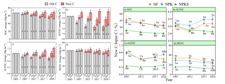 在长期秸秆还田对土壤有机碳动态影响方面取得了新发现(图4)。通过长达17年的定位试验,量化了秸秆还田条件下土壤有机碳及其组分中新、老碳的周转速率。结果显示,连续秸秆还田显著增加了土壤中新形成有机碳的占比(最高可达25%),有效提升了土壤有机碳含量。然而,研究也揭示了秸秆还田在促进新碳固定的同时,也可能加速土壤原有稳定性组分中老碳的分解,且外源秸秆碳的转化效率相对较低。这为更全面、辩证地评价秸秆还田的固碳效应及其长效机制提供了重要数据支撑。