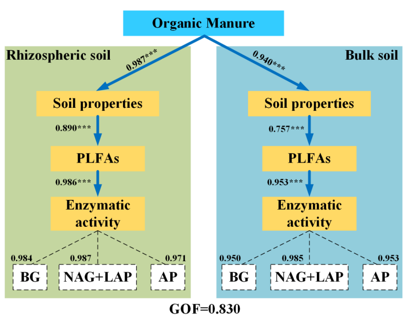 图1. 大豆根际和非根际土壤对不同有机肥施用量响应的偏最小二乘法路径分析图