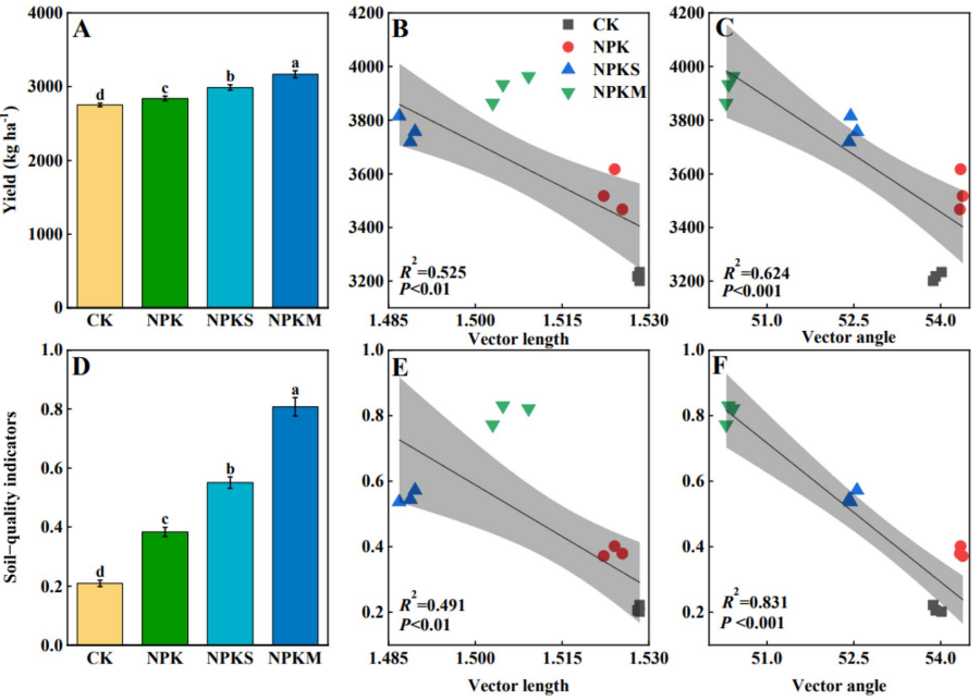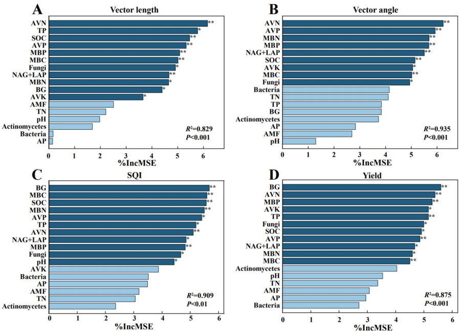 图2. 向量长度(A)、向量角度(B)、土壤质量指数(C)和大豆产量的潜在驱动因素