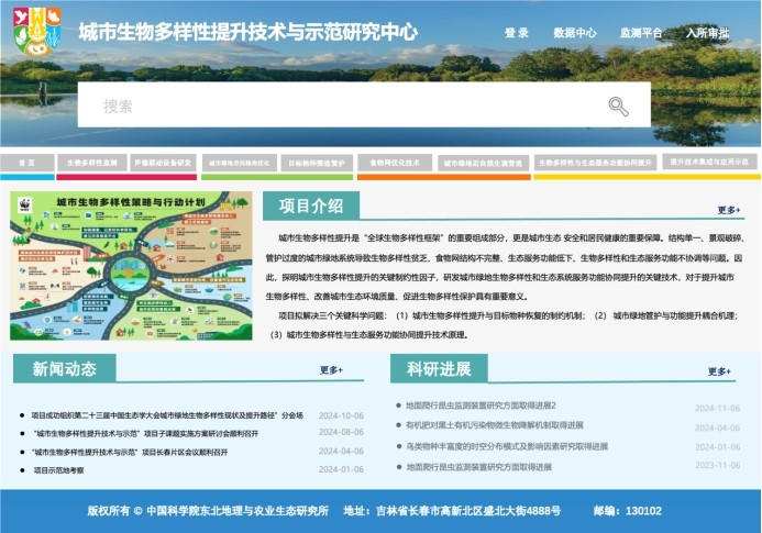 构建了生物多样性监测平台的基本框架、执行逻辑和基本前端布设,包括网页部分与监测平台两部分。网页部分右上角列出数据中心、监测平台两个主页面跳转按钮,提供查找功能。导航条为子课题名称,二次导航条内容在表7列出,每个部分介绍主题以及各考核指标的进展与更新描述,以专项形式介绍与科普当前研究进展主页包括项目介绍、新闻动态以及科研进展。新闻动态部分介绍各项目当前进展,包括设备安装成功、会议顺利召开、考察活动等;科研进展展示公开发表的可检索论文,当前项目的进展如设备研发的参数更新等。