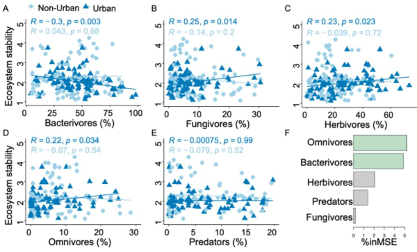 中国科学院城市环境研究所朱永官院士团队孙新研究组,在中国12个城市对城市-城郊的土壤线虫功能群相对数量与生态系统稳定性的关系进行了调查研究。同时,该研究对相关结论进行了全球尺度数据的验证。结果表明,城市化降低了土壤杂食性和捕食性线虫的相对数量,增加了食细菌和食真菌线虫的相对数量,并使其群落结构更加同质化。相对城郊土壤,仅城市食细菌、食真菌、植食性和杂食性土壤线虫相对数量与生态系统稳定性的关系呈现显著,同时,杂食性和食细菌线虫是生态系统稳定性的主要贡献因子。因此,本研究建议,在制定城市土壤生物多样性保护战略时,需考虑不同功能群的特点,增加生境的多样性,同时,需要优先制定高营养类群的保护措施,特别是杂食性的类群。