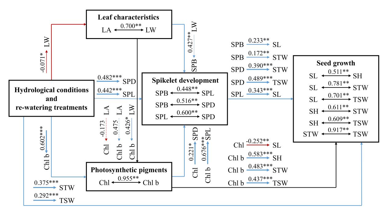 研究结果表明,初始水文条件和分时补水措施显著影响了瘤囊薹草的小穗发育、种子生长、叶片发育以及光合色素积累。相较于其他处理,湿润条件结合第15天补水至初始水文状态的水文情势显著增强了瘤囊薹草小穗发育特征、种子生长特性,且叶片生态特征及叶绿素含量均高于其他处理条件。此外,小穗发育特征和种子生长性状与叶片生态特征和叶绿素含量表现出显著的相关性。在驱动机制方面,水文条件及补水情境直接影响了瘤囊薹草的小穗发育和种子生长,同时还通过调控叶片宽度和叶绿素b含量从而间接影响小穗发育过程和随后的种子生长活动。总体而言,精准补水措施通过多种途径显著影响瘤囊薹草的小穗发育和种子生长。结合半干旱区气候特征及农业发展状况,实施洪水和融雪水资源集约化利用以及农业-生态水资源共管可作为半干旱地区高效利用水资源的关键策略。