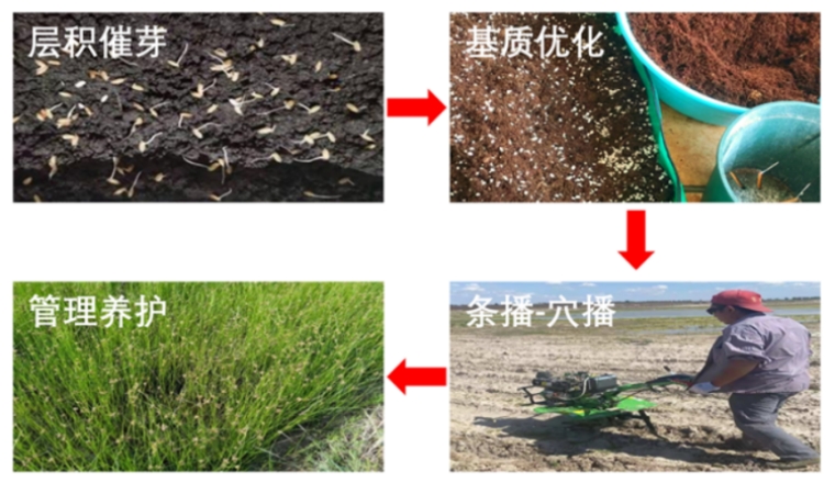 在种源提质环节,通过对水文条件的精准调控,显著提升了种子的产量与品质,为后续恢复工作提供了充足且优质的种源基础;萌发诱导阶段则采用化学处理手段,成功打破种子的深度休眠特性,使萌发率较自然状态提升超过 6 倍;而在直播成苗环节,借助土壤水分梯度管理技术,实现了种子在野外环境中的高效定植与快速覆盖,有效加快了植被恢复进程。