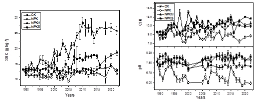 根据统计分析结果(图1),1989年黑土土壤有机碳(SOC)含量为13.2 g/kg,不同处理下,土壤SOC随时间变化显著,截至2022年NPKM和NPKS处理中SOC含量分别为25.8和18.7 g/kg,分别显著提高了95%和42%(P <0.05)。而NPK处理中SOC含量为11.9 g/kg,显著降低了9.8%(P <0.05)。另外,长期单独施用化肥处理下(NPK),土壤酸化现象显著,与1989的7.6相比,NPK处理中pH降低至5.97.