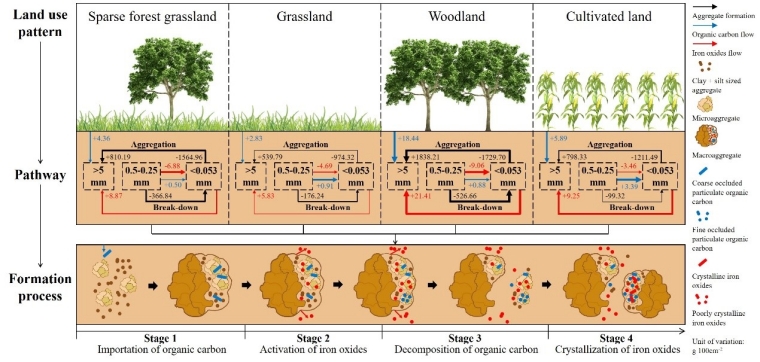 未经人为利用的淋溶土团聚体形成中并无明显的主要胶结物质。在外力侵蚀等作用影响下,埋藏于地下的淋溶土出露地表后受到了人为土地利用活动影响,经历了(1)有机碳输入;(2)铁氧化物活化;(3)有机碳分解;(4)铁氧化物结晶化的过程,团聚体形成中主要胶结物质转变为有机碳和铁氧化物。当C/(Fed-Feo)摩尔比值>2.13时,有机质是团聚体形成中主要胶结物质。当C/(Fed-Feo)摩尔比值<2.13时,晶质铁是团聚体形成中主要胶结物质(图1)。在胶结物质的动态变化下,团聚体形成过程以<0.053mm团聚体不断聚合形成>5mm团聚体,伴随0.25-0.5mm团聚体的破碎为主(图2)。然而,大团聚体破碎为微团聚体和粉+黏粒级的过程被掩盖,表明人为土地利用活动下团聚体的聚合程度远高于破碎程度。其中,疏林荒草地(0.60g cm-2 ka-1)和林地(0.38g cm-2 ka-1)中大团聚体的累积聚合速率显著高于荒草地(0.29g cm-2 ka-1)和耕地(0.27g cm-2 ka-1)。可见,人为土地利用活动促进了第四纪古红土团聚体的聚合。以上研究结果为辽河平原温性农田淋溶土的科学管理和可持续利用提供了科学依据。