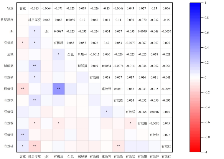 选取容重、耕层厚度、pH、有机质、全氮、碱解氮、有效磷、速效钾、有效铁、有效锰、有效铜、有效锌、有效硅、交换性钙和交换性镁15个指标作为农田质量评价的全量数据集(TDS),对指标进行主成分分析,KMO>0.5.满足主成分分析的要求。提取了特征根值>1的7个主成分(累计贡献率为62.772% > 50%),并结合各指标间的Pearson相关系数构建农田土壤质量评价最小数据集。确定了容重、耕层厚度、pH、全氮、碱解氮、有效磷、速效钾、有效锰和有效铜共计9项指标作为最小指标集。最后,通过SQI指数开展最小数据集合理性验证,确定选取的9个指标作为最小指标集相对偏差很小,评价精度较高,选取的最小数据集能够很好地体现全数据集中对于土壤质量评价的信息,具有代表性。