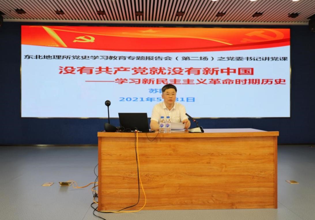 会上,所党委书记苏阳围绕新民主主义革命时期的历史作题为《没有共产党就没有新中国》的专题辅导报告。他以《没有共产党就没有新中国》歌词开篇,从新民主主义革命的历程和新民主主义革命取得胜利的启示两方面为与会党员上了一堂精彩的党史教育课。报告深入浅出、引经据典,既富有理论性,又通俗易懂,让全体党员深受启发,获益非浅。苏阳要求各党支部和全所党员同志一定要把《东北地理所党史学习教育工作计划》落到实处,同时,他对研究所开展党史学习教育工作提出四点要求:一是要把学习党史与强化党对科技事业的全面领导结合起来;二是要把学习党史与强化国家战略科技力量、加快科技自立自强结合起来;三是要把学习党史与科技创新和关键核心技术攻关结合起来;四是要把学习党史与学习新中国史、改革开放史、社会主义发展史、院史所史结合起来,与弘扬科学家精神结合起来,为圆满完成院党组交给我们的“黑土粮仓”科技会战任务汇聚强大的精神力量。