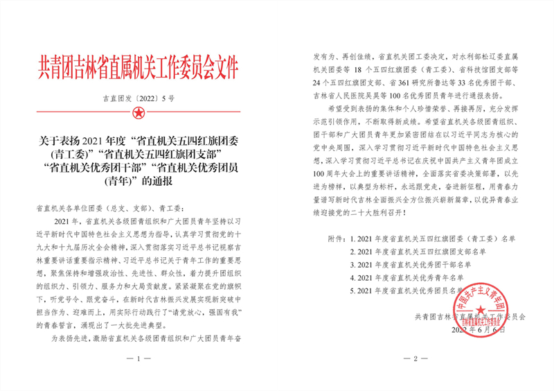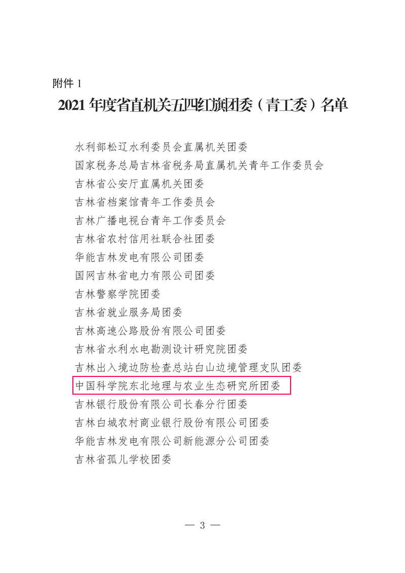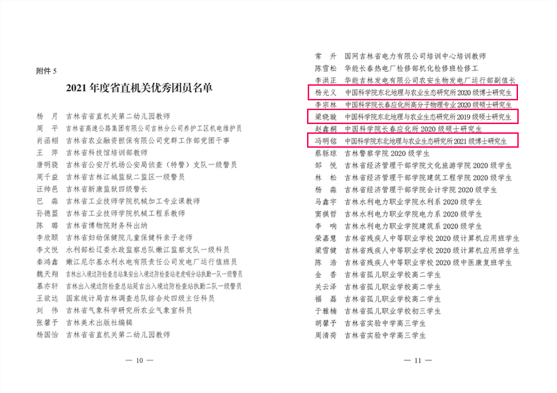 为表扬先进,激励团青组织和广大团员青年奋发有为、再创佳绩,省直机关团工委对18个五四红旗团委(青工委)、24个五四红旗团支部、33名优秀团干部、100名优秀团员青年进行通报表扬。中国科学院东北地理与农业生态研究所团委荣获“2021年度省直机关五四红旗团委”称号,2020级博士研究生杨光义、2019级硕士研究生梁晓璇、2021级博士研究生冯明铭荣获“省直机关优秀团员”称号。