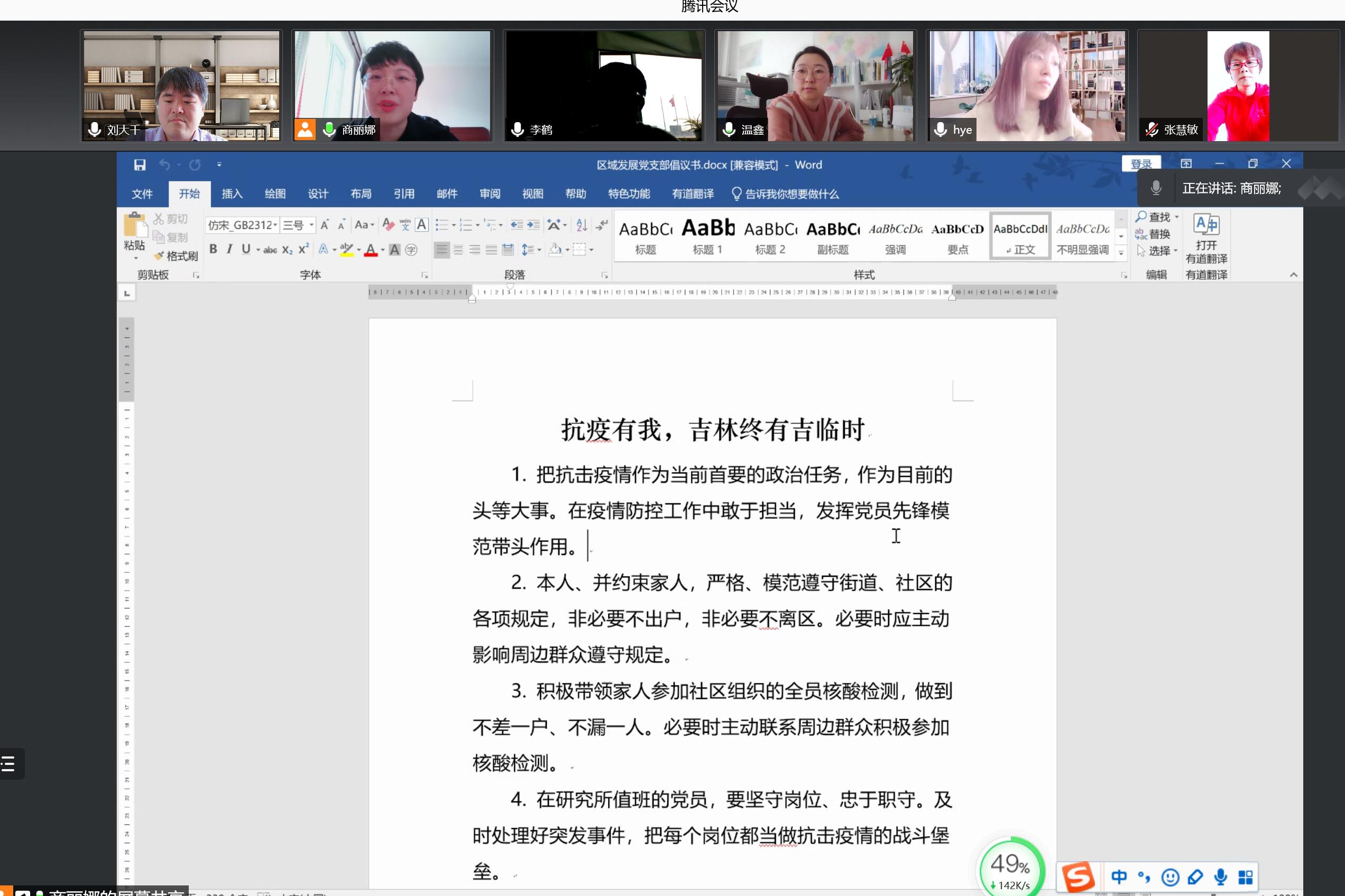2022年3月25日下午,区域发展党支部在线上召开了主题党日活动,活动的主题为“抗疫有我,吉林终有吉临时”,活动由支部书记商丽娜主持,支部全体党员参加。