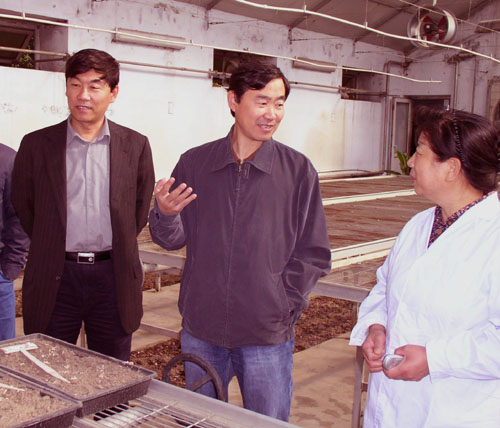 在农业技术中心,何兴元所长在刘晓冰副所长等陪同下,参观了园区以及相关基础设施,查看了在园区内的科研实验布设状况和室内实验室,并不时地与有关人员详细了解相关情况和工作进展。随后与中心全体职工和研究生举行了座谈会,在刘晓冰副所长主持下,十余名科研骨干围绕各自科研工作和研究所发展畅所欲言,何所长在总结讲话中就大家关心的主要问题进行了解析,并着重就研究所重大科研项目组织、创新成果培育、平台基地建设、人才队伍建设以及学科组等科研组织结构体系完善、考核体系以及创新文化建设等方面做了阐述。